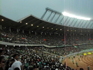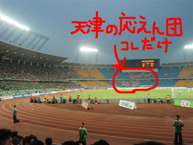 前もってそんな説明もないから、最初中国人も「何だこの音は?」くらいだったんだけど、試合も後半になれば応援も…ではなく野次も白熱するわけで、スピーカーから電波音も激しくなるワケで…もう煩かったよ。しまいには観客達が怒って放送席に向かって一斉に「しゃーぴーしゃーぴー」と叫んでいた。