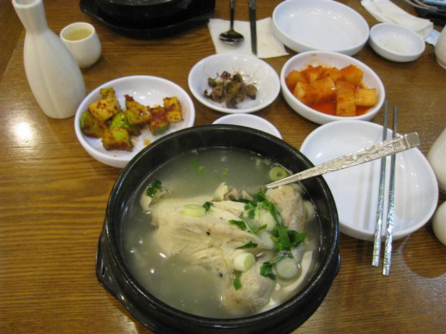 サムゲタンはトリ丸々1羽を煮込んだスープなんだけど、トリの中にもち米とかサンザシとか朝鮮人参とか色々な具が入っていて栄養価も高いし優しい味で美味しい。