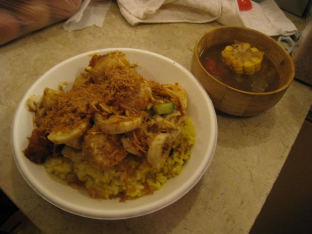 と言われてそのままご好意に甘えて、お店で晩ご飯を頂いた。外で買ったおかずと、お店で作ったお粥?スープ?とか食べた。