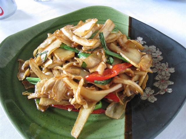 【エリンギかな?の炒め物】 【エビと何かの葉の揚げ物。絶品】